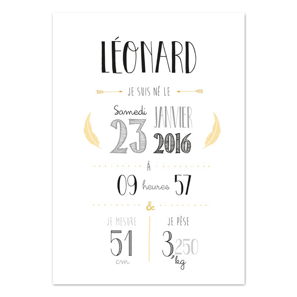 Cette affiche unique célèbre l'arrivée de votre petit trésor en affichant toutes les informations importantes : prénom, date de naissance, heure, poids et taille.