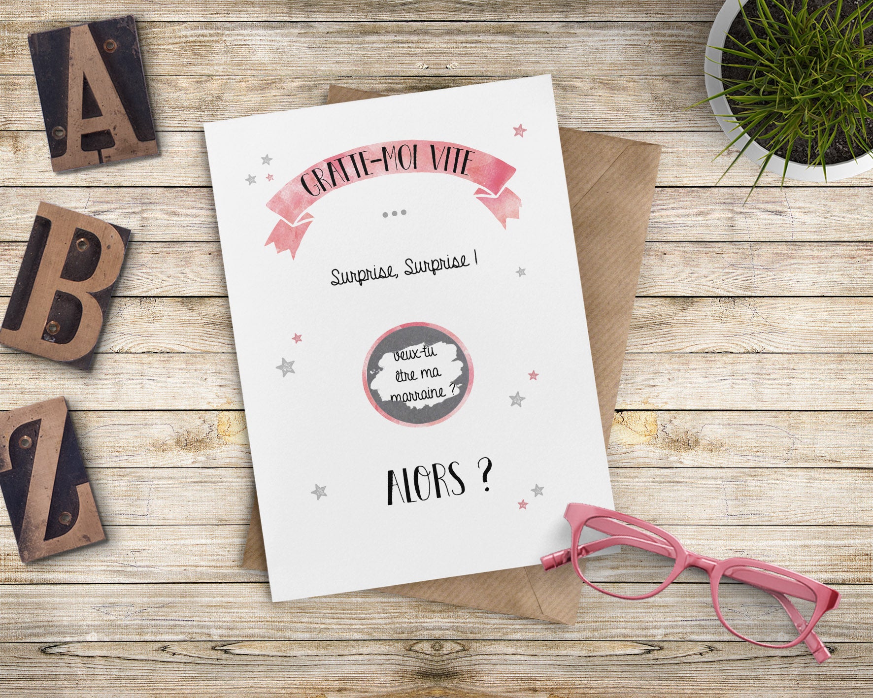 Annoncez la grande nouvelle avec style ! Cette carte à gratter originale est le moyen parfait pour demander à quelqu'un d'être la marraine de votre enfant.